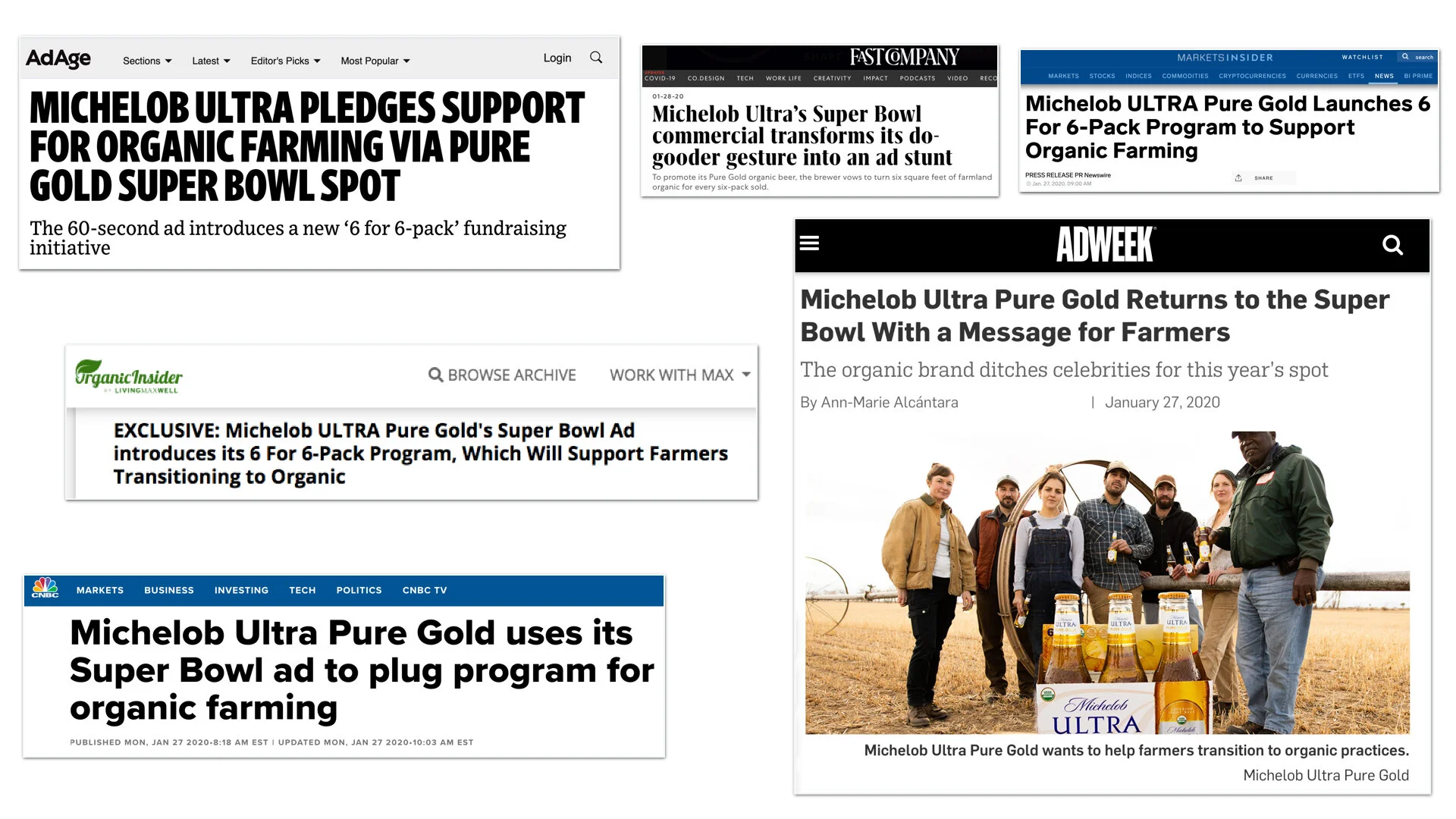 For Super Bowl 2020, Pure Gold unveiled “6 For 6-Pack,” a long-term commitment in which the brand will help farmers convert 6 square feet of farmland to organic through funding and support for every 6-pack of beer sold. The Super Bowl commercial visually shows that regardless of who you are or where you live, you can help change America’s farmland, just by having a beer.