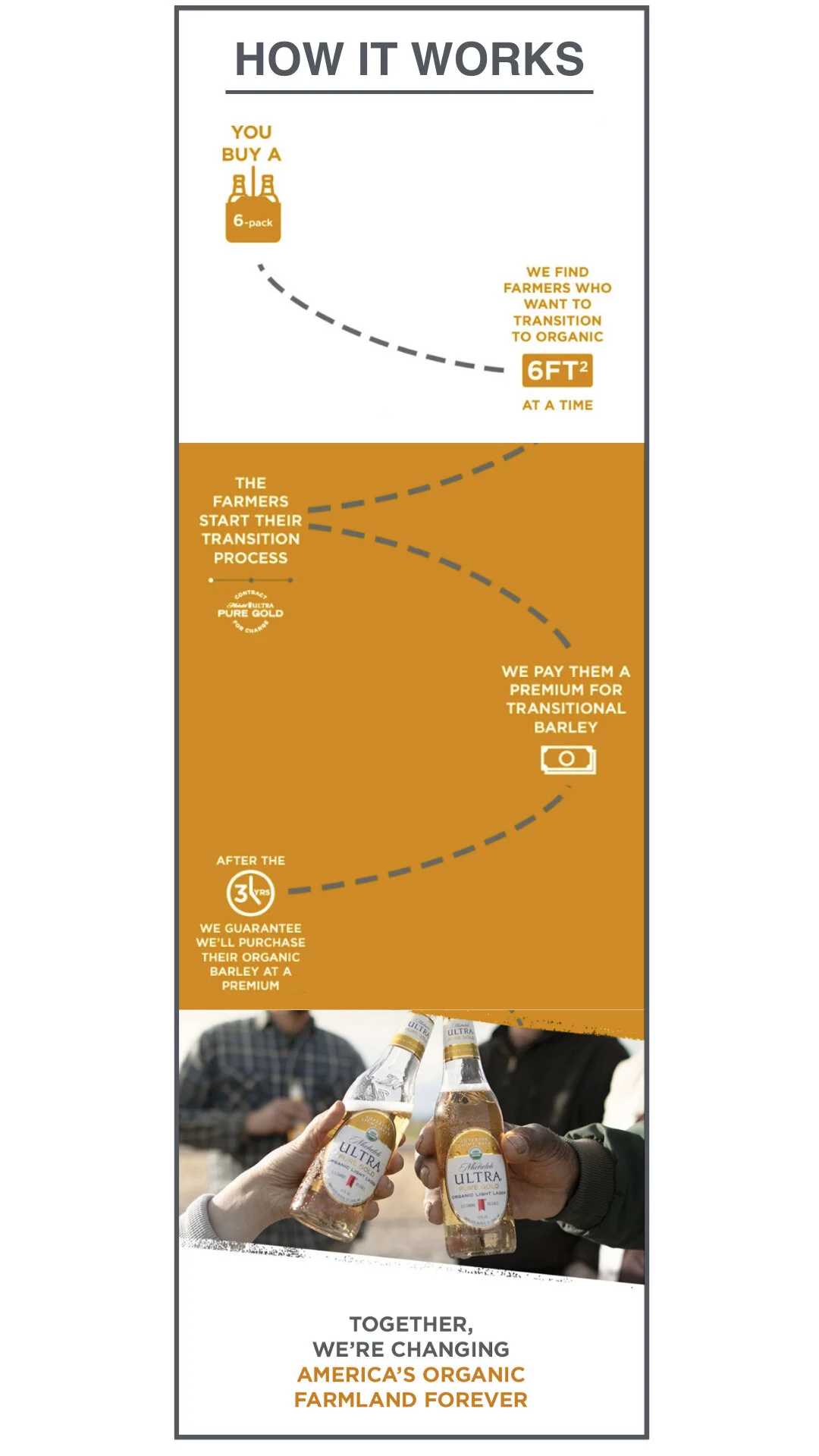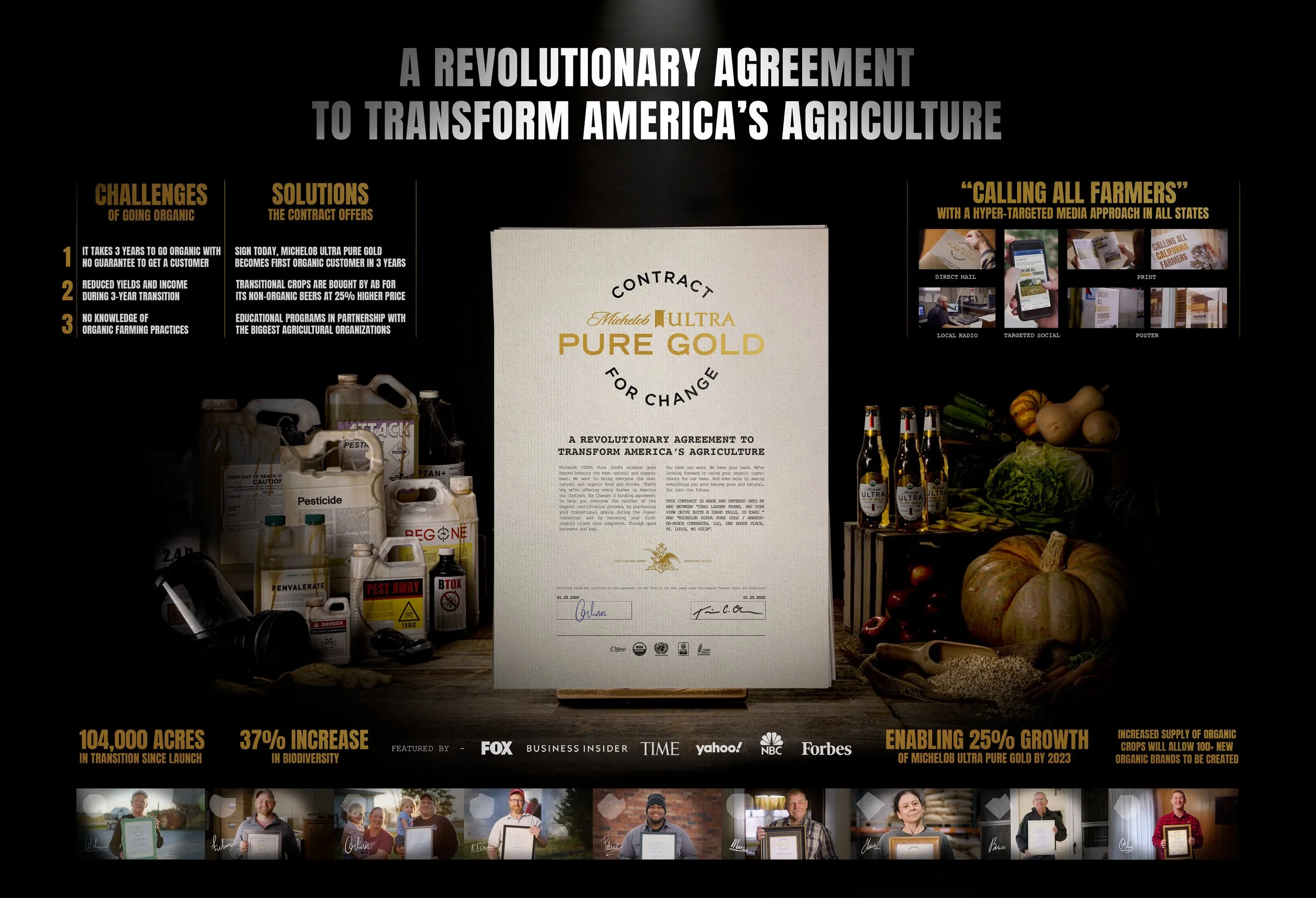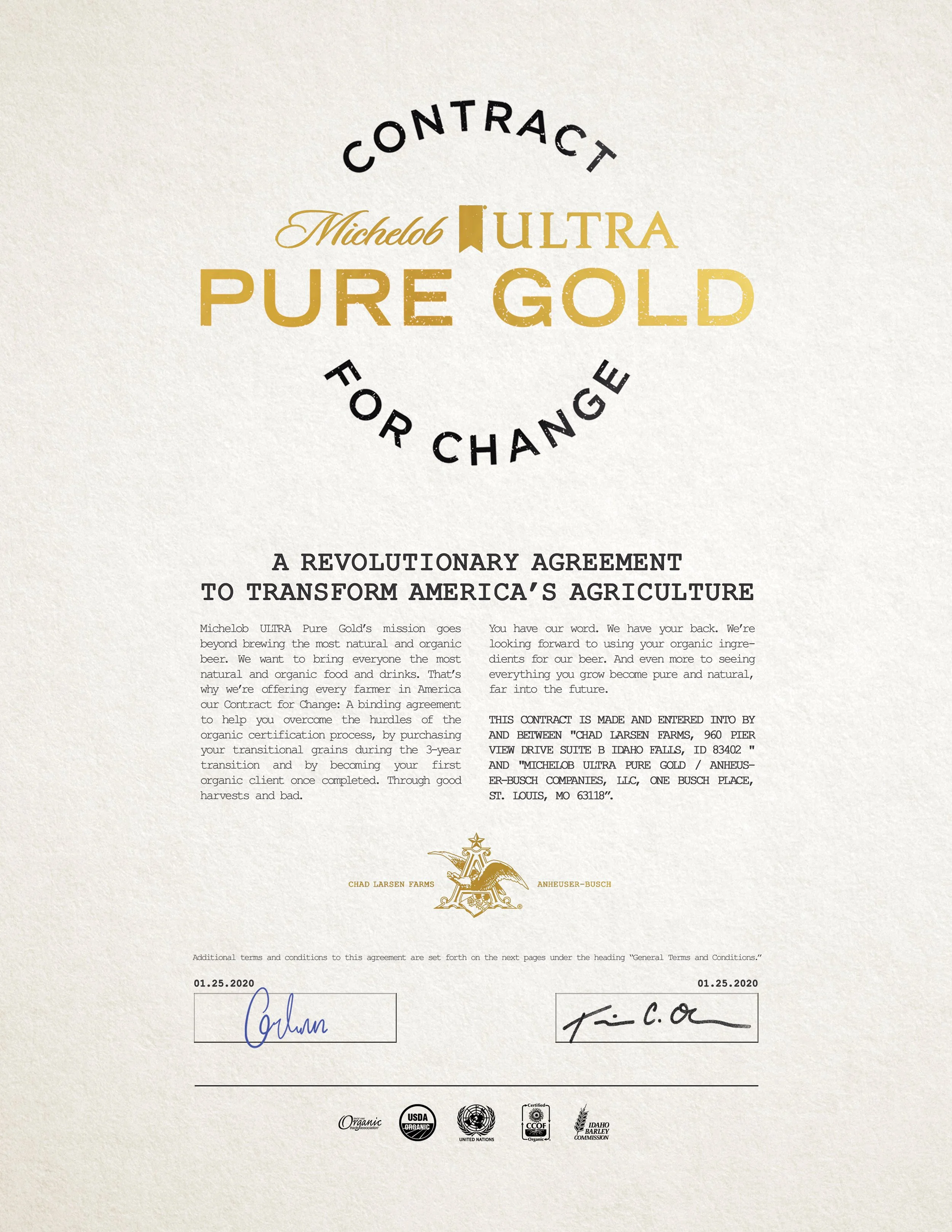 Michelob ULTRA Pure Gold’s mission goes beyond brewing the most natural and organic beer. We want to bring everyone the most natural and organic food and drinks. That’s why we’re offering every farmer in America our Contract for Change: A binding agreement to help you overcome the hurdles of the organic certification process, by purchasing your transitional grains during the 3-year transition and by becoming your first organic client once completed. Through good harvests and bad.